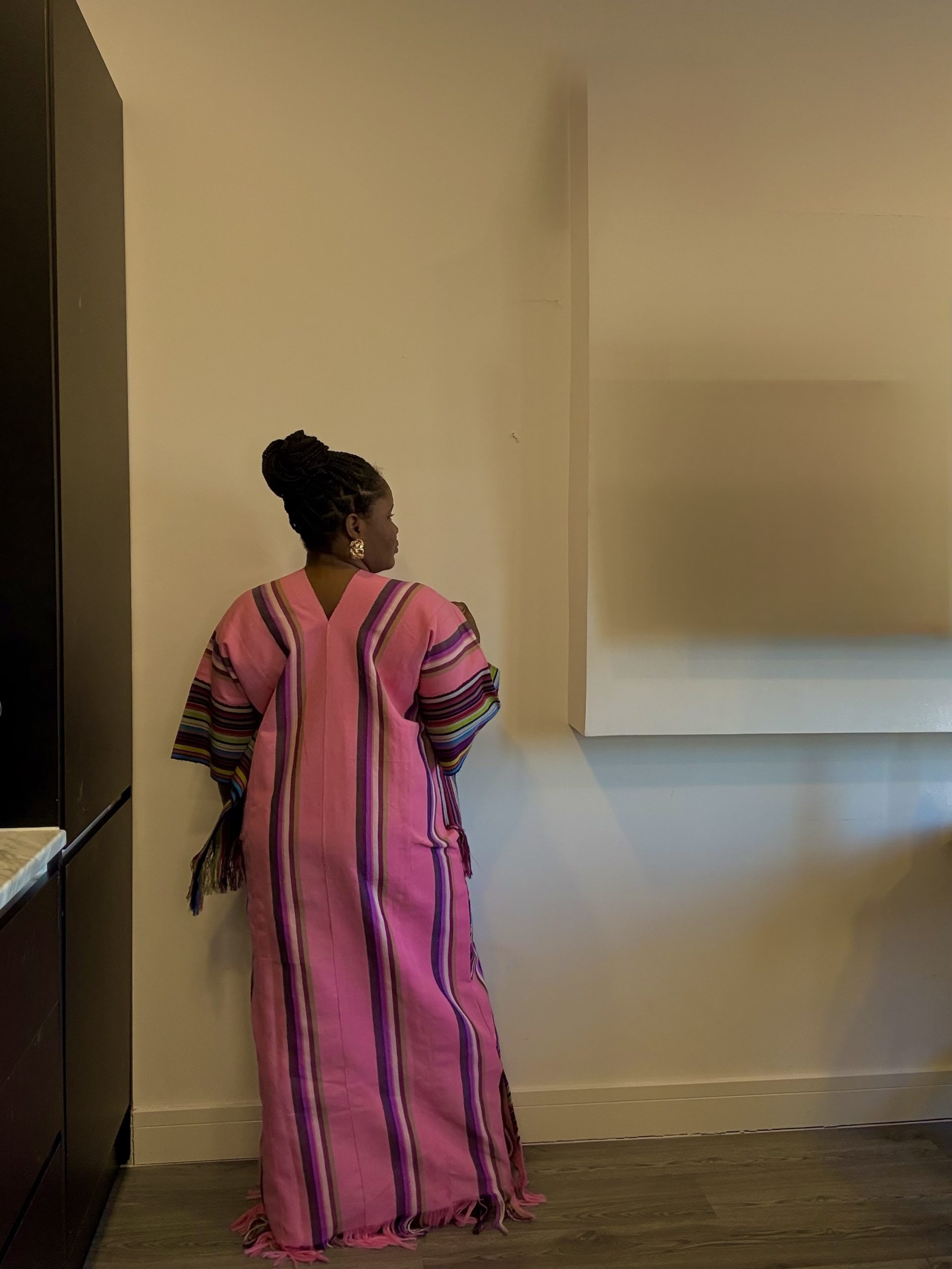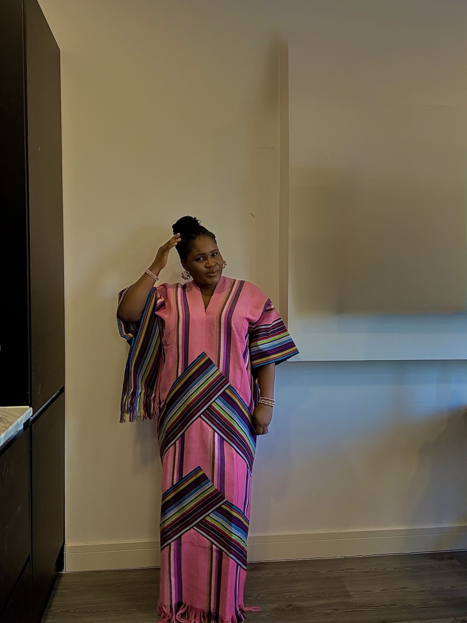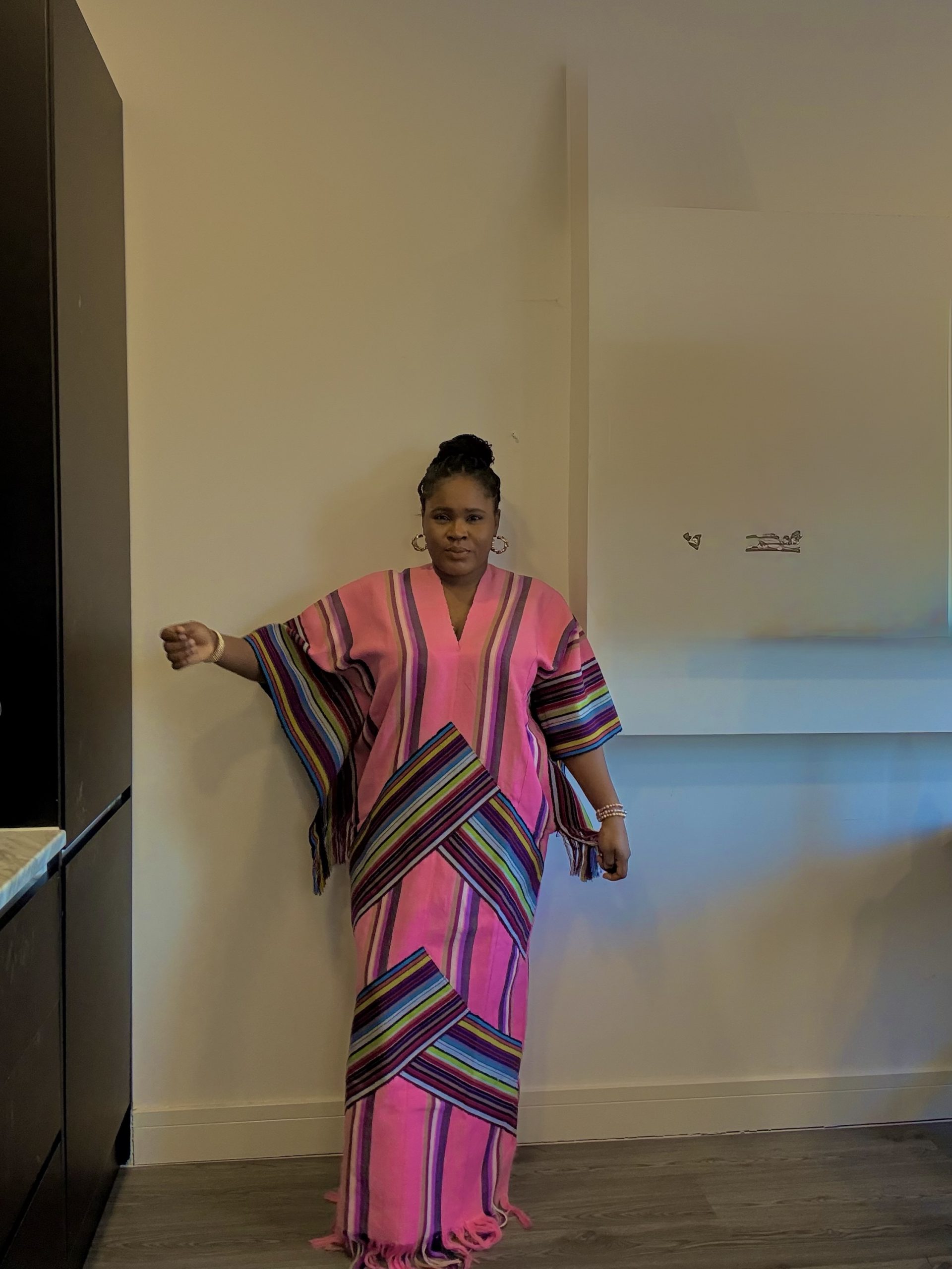 Celebrate culture and couture with the Adunni Heritage Gown, a modern twist on traditional Aso Oke elegance. This fitted gown features a vibrant pink base adorned with striking inverted V-shaped panels of multicolored vintage Aso Oke fabric. From the extended length to the eye-catching fringe details at the hem and sleeve edges, every element is designed to turn heads. The bold woven patterns reach the knees, adding structure and contrast to the flowy silhouette. Whether for weddings, cultural events, or standout moments, this gown is where heritage meets high fashion.