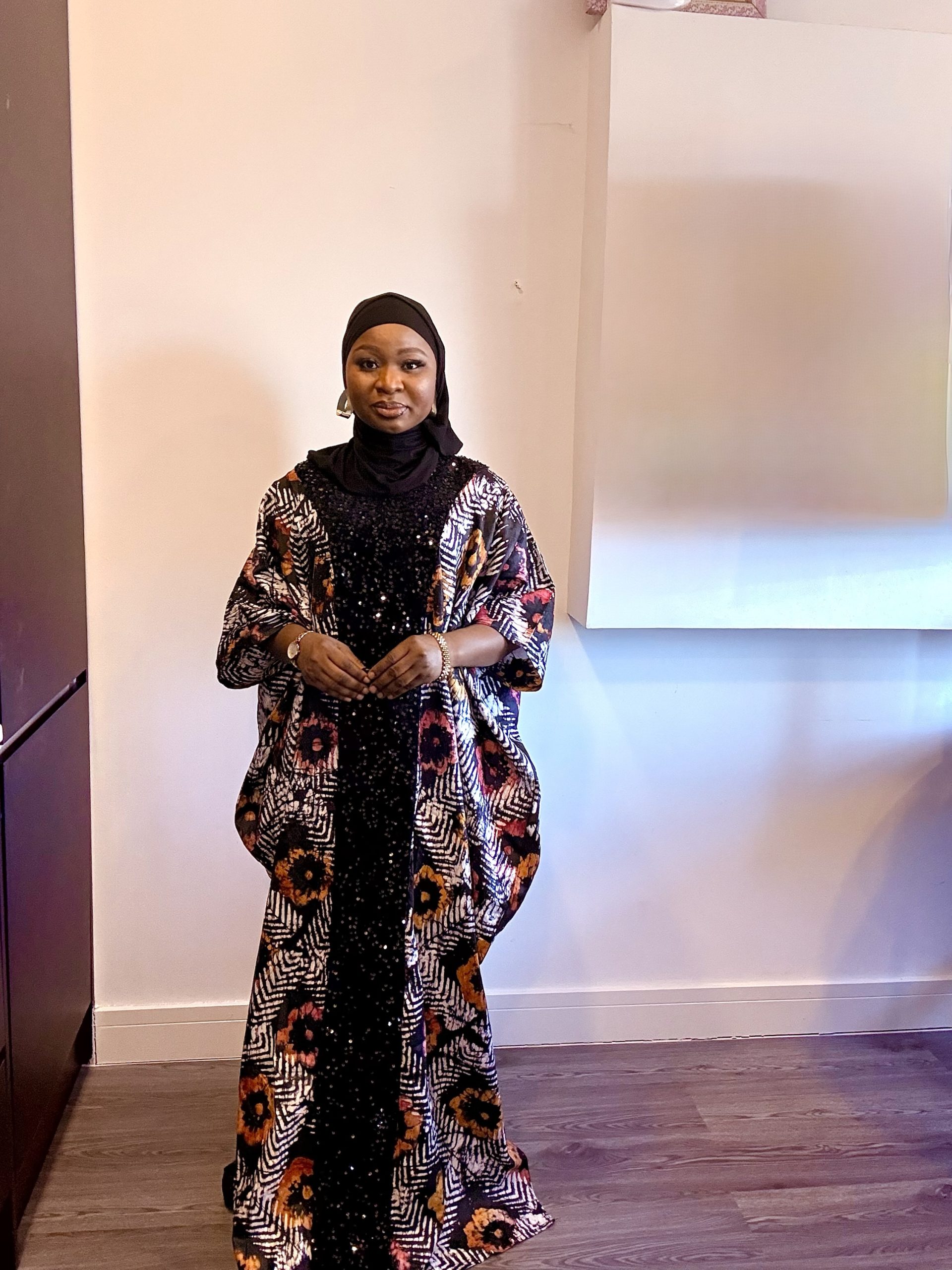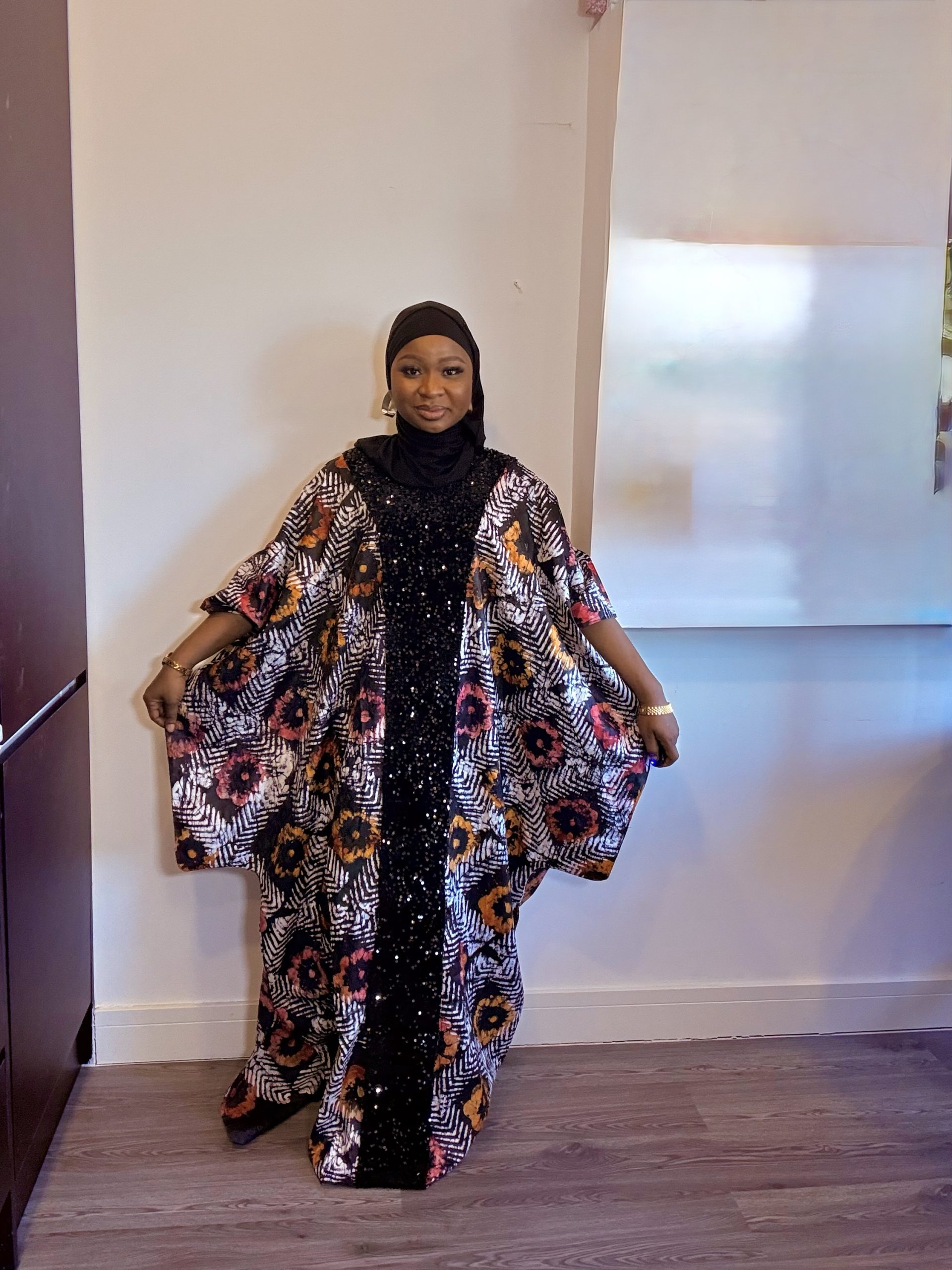 Elevate your wardrobe with this elegant Adire brocade boubou gown, crafted for the modern woman who values comfort, culture, and style. This flowing gown features a lightweight fabric that drapes beautifully, mid-length sleeves that reach the knees, and a stunning front panel adorned with shiny sequins for a hint of sparkle. The traditional Adire patterns blend effortlessly with the contemporary design, creating a piece that’s perfect for special events, religious gatherings, or stylish everyday wear. A matching scarf is included to complete the look.