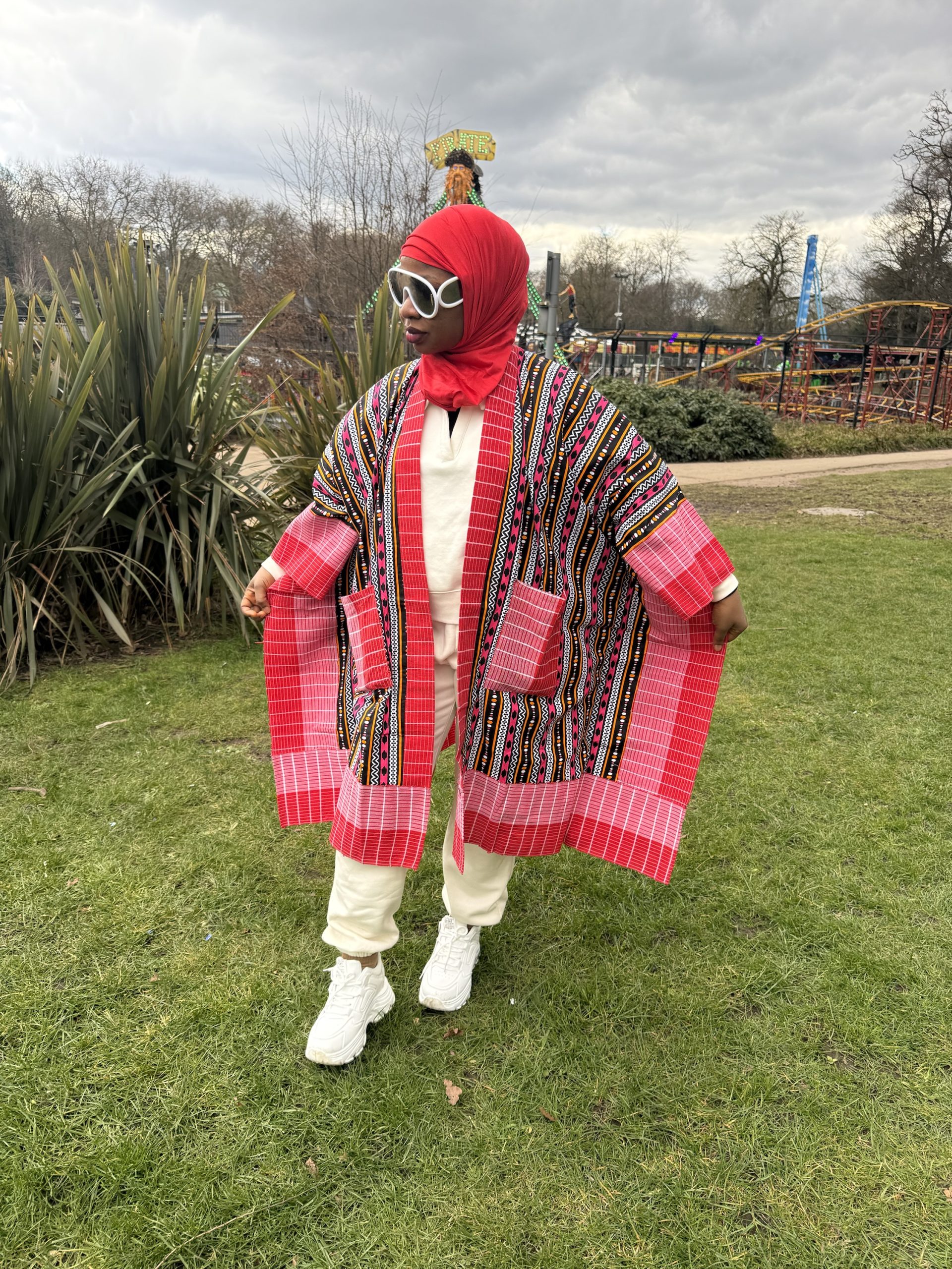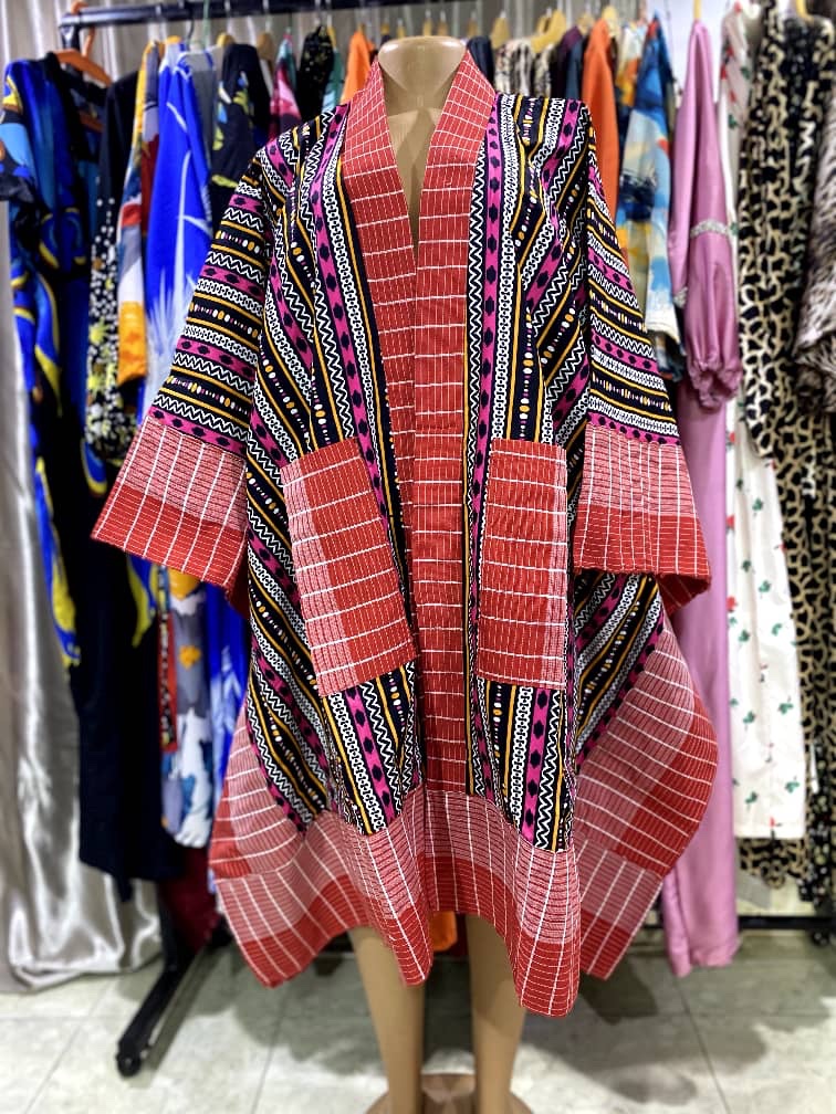 Step into elegance and culture with this vibrant Pink Ankara Boubou Kimono, beautifully accented with rich Aso Oke fabric. This unique piece combines traditional African textiles in a modern, flowing silhouette. The kimono features bold pink tones with stripes and columns of multi-color patterns, finished with Aso Oke trim on all edges except the hem and sides. Two front patch pockets made from matching Aso Oke add style and function.