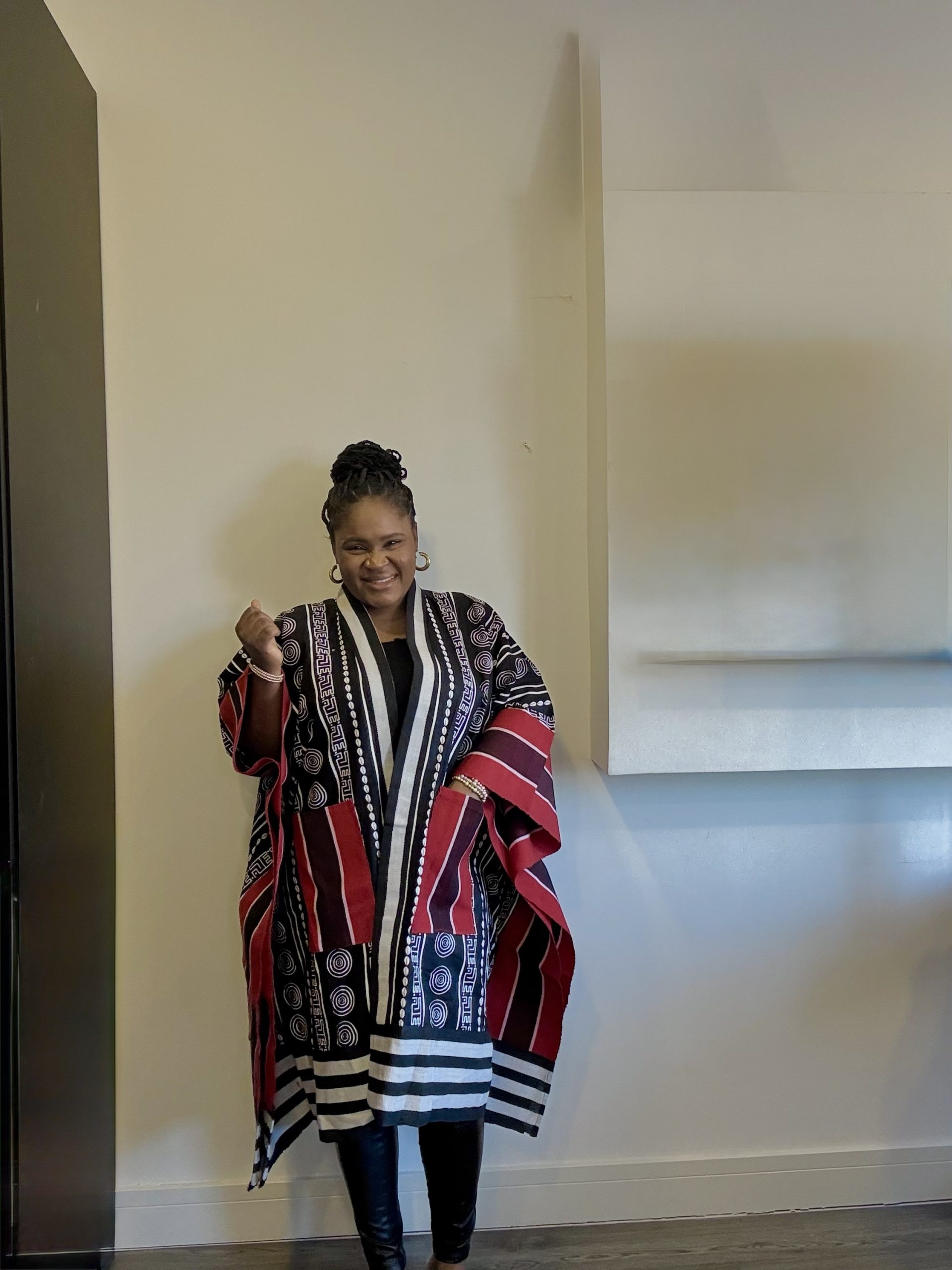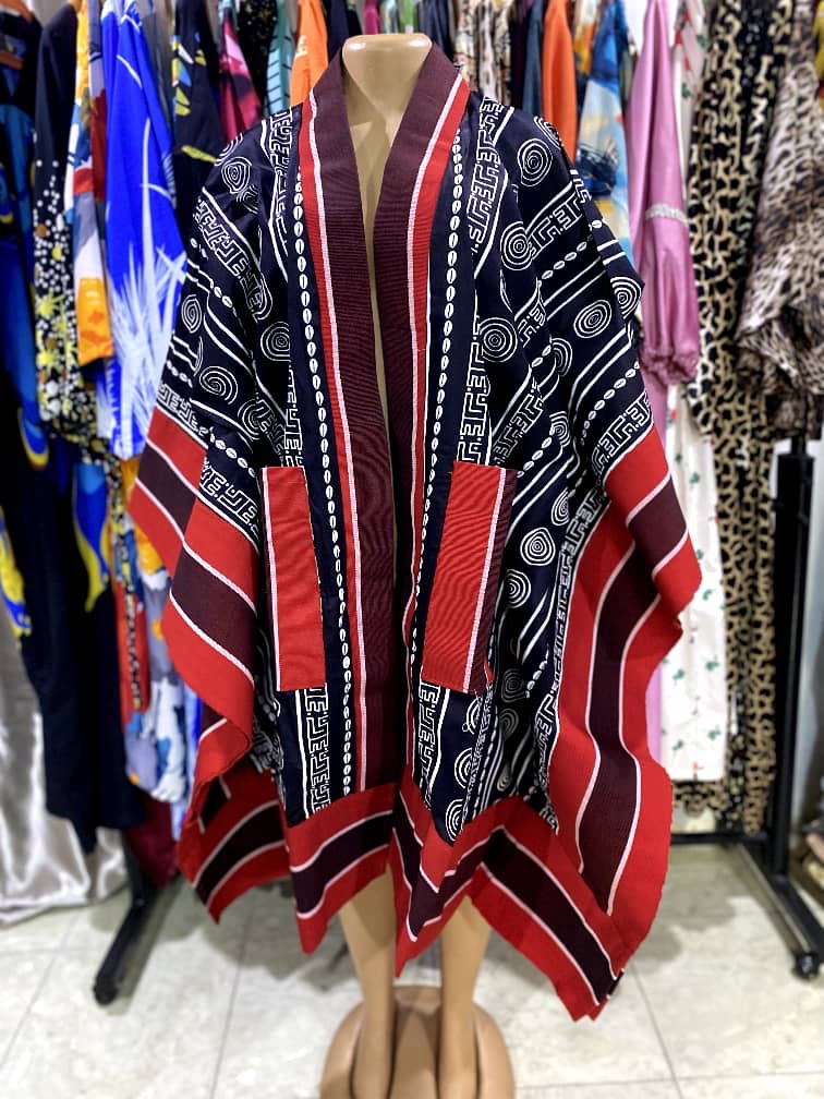Make a bold cultural statement with this Black Ankara Boubou Kimono, richly accented with Aso Oke fabric in striking red, white, and black stripes. This stylish piece fuses modern comfort with African tradition, offering a flowing silhouette and eye-catching details. It’s designed with two front pockets crafted from the same vibrant Aso Oke, providing both elegance and utility.